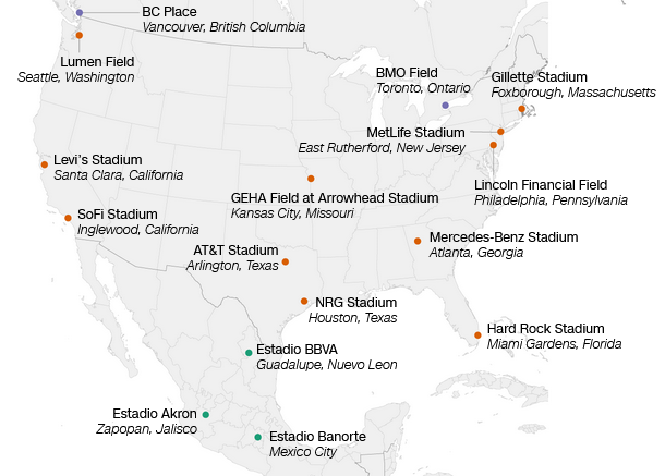 The World Cup will be played in 16 venues across Canada, Mexico and the United States.