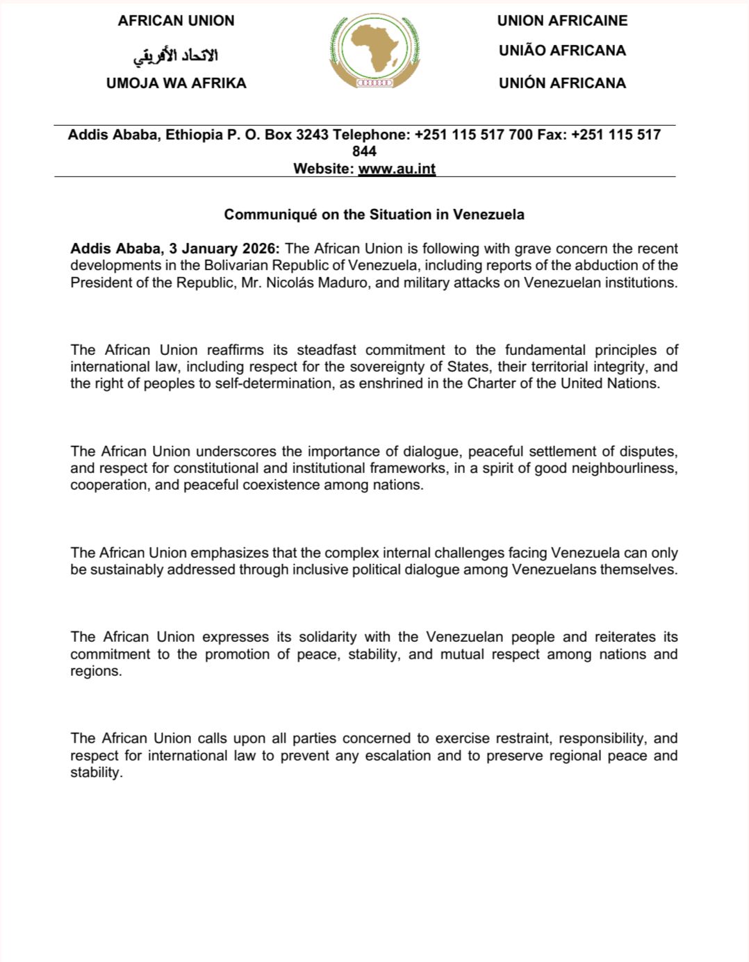 The African Union expresses its solidarity with the Venezuelan people and reiterates its commitment to the promotion of peace, stability, and mutual respect among nations and regions.