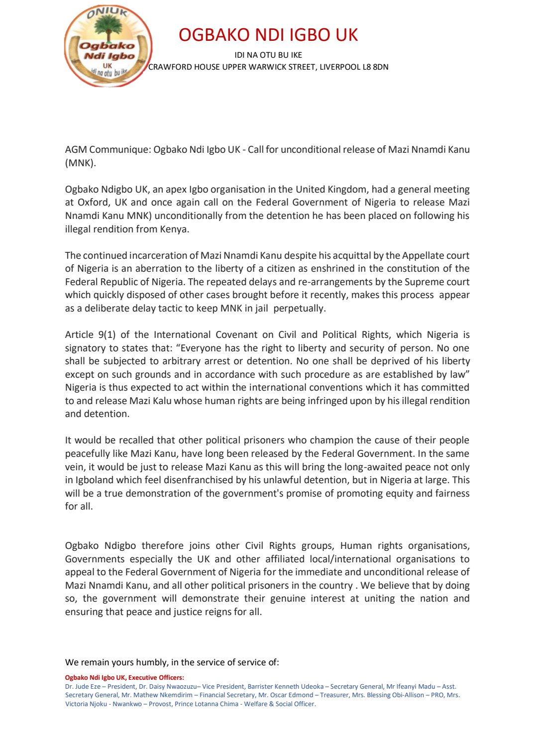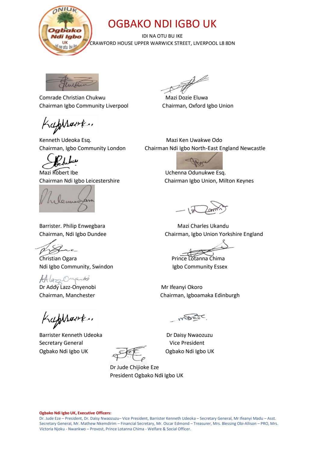 Other signatories to the communique include: the Chairman Igbo Community Liverpool, Comrade Christian Chukwu; Chairman Oxford Igbo Union, Mazi Dozie Eluwa; Chairman Igbo Community London, Kenneth Udeoka Esq; Chairman Ndi Igbo North-East England Newcastle, Mazi Ken Uwakwe Odo; Chairman Ndi Igbo Leicestershire, Mazi Robert Ibe; Chairman Igbo Union, Milton Keynes, Uchenna Odunukwe Esq; Chairman Ndi Igbo Dundee, Barrister. Philip Enwegbara; Chairman Igbo Union Yorkshire England, Mazi Charles Ukandu; Ndi Igbo Community, Swindon, Christian Ogara; Igbo Community Essex , Prince Lotanna Chima; Chairman, Manchester, Dr Addy Lazz-Onyenobi; and Chairman, Igboamaka Edinburgh, Mr Ifeanyi Okoro.