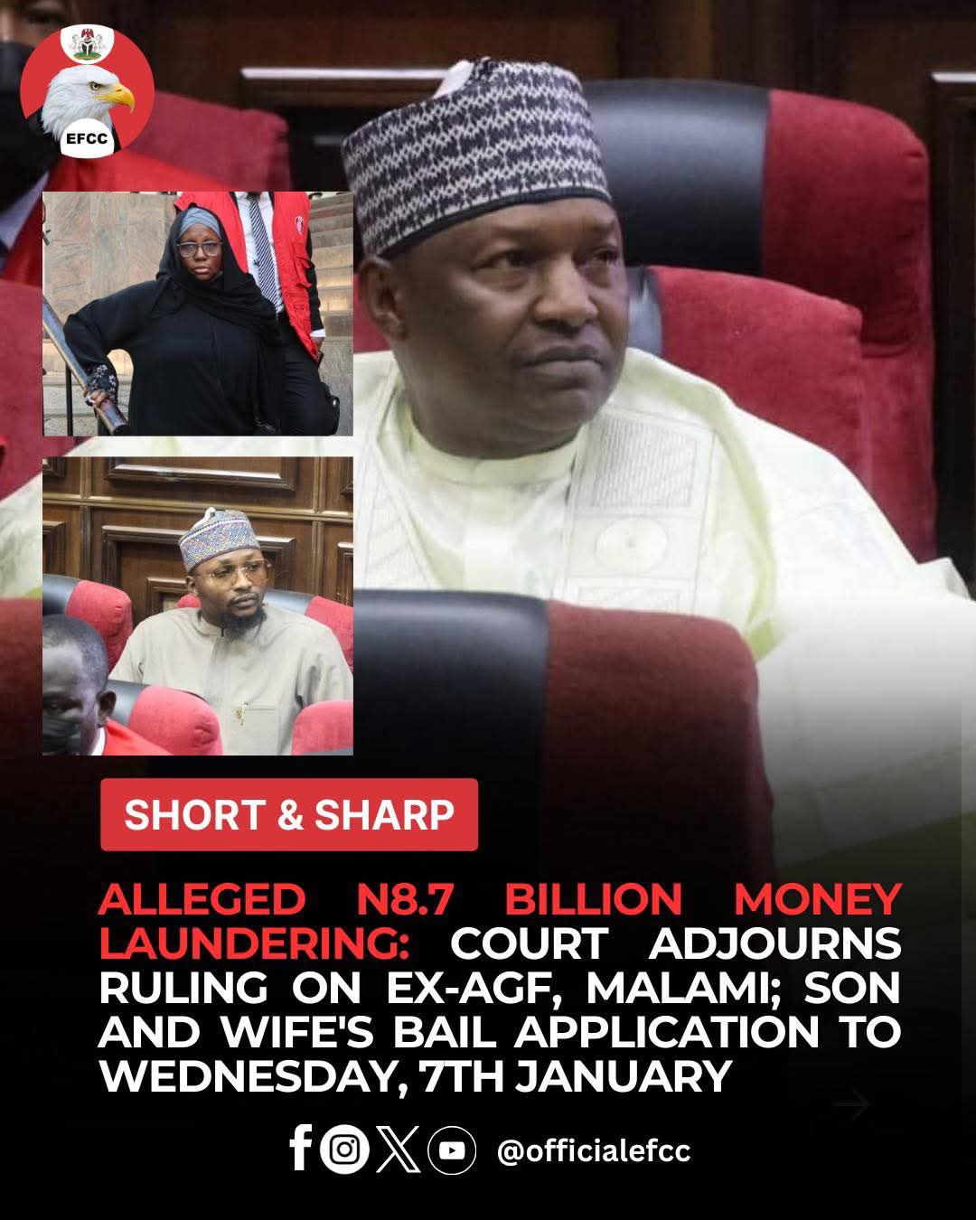 Justice Emeka Nwite of the Federal High Court, sitting in Maitama, Abuja, on Friday, January 2, 2026, further remanded former Attorney General of the Federation and Minister of Justice, Abubakar Malami, SAN, his son, Abubakar Abdulaziz Malami, and his wife, Hajia Bashir Asabe, in the Kuje Correctional Centre, Abuja, till January 7, 2026, for ruling on their bail applications.