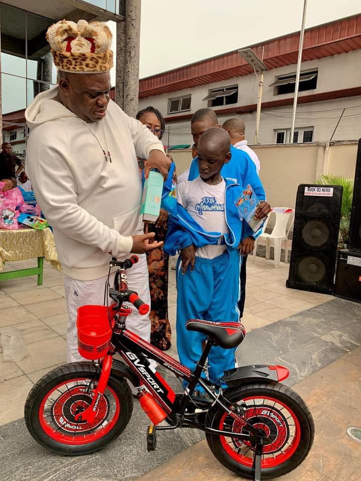 During the celebration, His Royal Majesty took time to donate bicycles to all the Down Syndrome children in OPM free school for children Born with Autism and Down Syndrome while various gifts were distributed to them together with food and drinks.