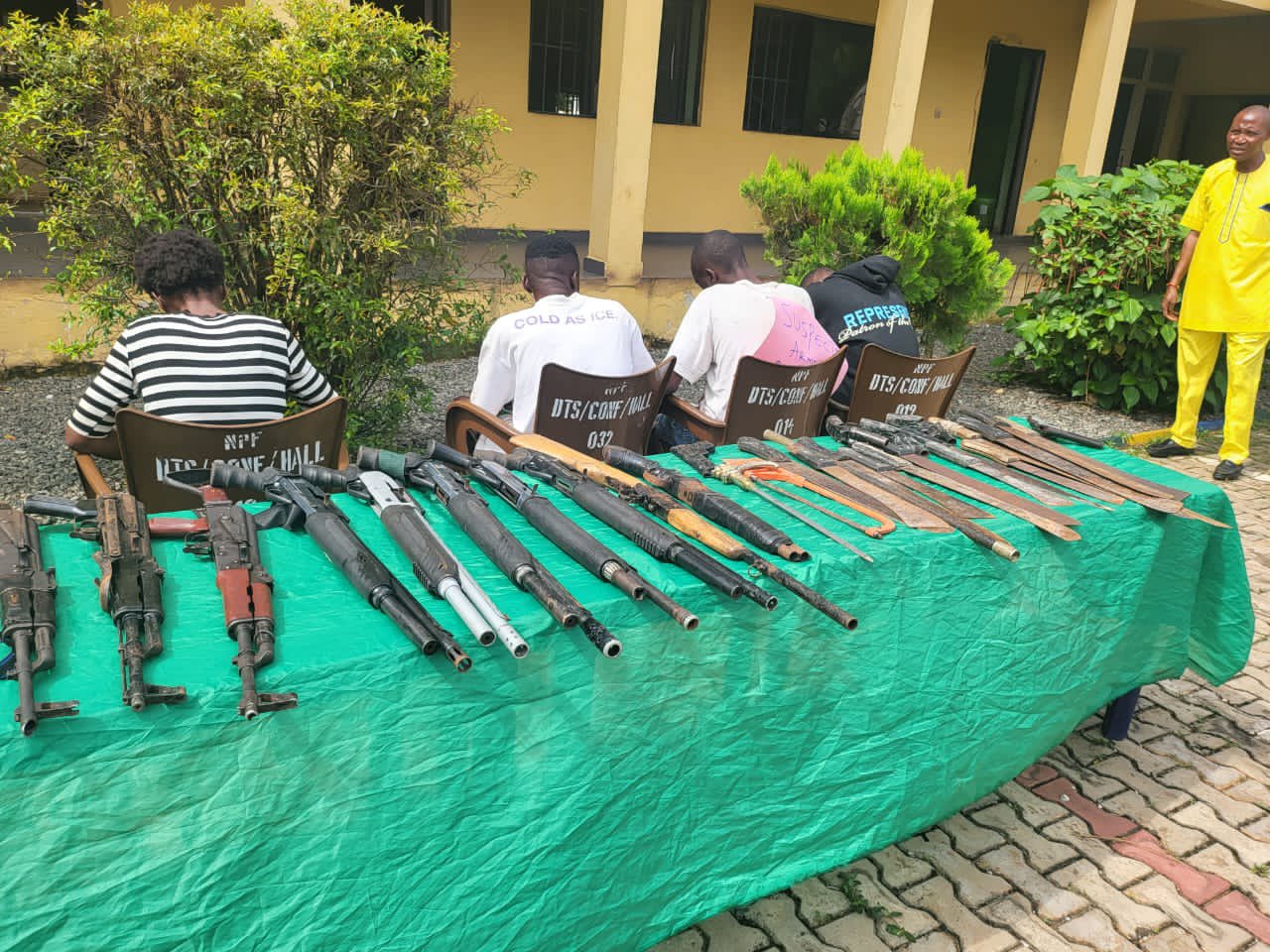 1. RECOVERY OF ONE AK-47 RIFLE LOADED WITH FIVE MAGAZINES, ONE ASSAULT RIFLE, TWO PUMP ACTION GUNS, DOUBLE BARREL GUNS, ONE HUNDRED AND SIXTY ONE ROUNDS OF 7.62MM LIVE AMMUNITION, AND CARTRIDGES: Following series of intelligence reports received on the activities of kidnappers/armed robbers in Ekpan Uvwie LGA, Warri and environs, on 03/07/2023 at about 1600hrs, the DPO led a combined team comprising policemen attached to Ekpan Police Station and personnel of 3 battalion Nigerian army on a sting operation and raided their hideout at Agadaga avenue off Jakpa road, Ekpan, where discreet search was conducted at an uncompleted building during which one (1) AK-47 Rifle with five (5) magazines loaded with One Hundred and Sixty-one (161) rounds of 7.62mm ammunition, one (1) Assault Rifle with two magazines loaded with fifty-nine (59) rounds of 5.56mm ammunition, two English pump-action guns, One Hundred and Ten (110) rounds of live cartridges, one (1) Double Barrel gun, one Single Barrel gun, one toy gun, fourteen (14) cutlasses, bunch of charms wrapped in a cap. Serious manhunt for the criminal syndicate is ongoing.