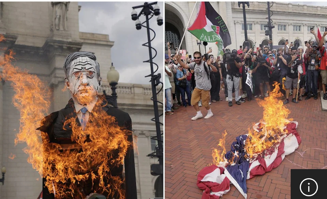 Protesters burned American flags and an effigy of Benjamin Netanyahu as the Israeli prime minister gave an address to the US congress.