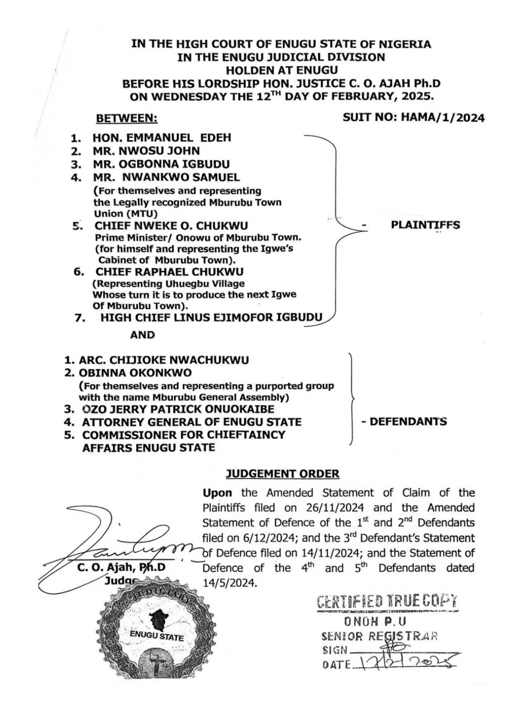The truth is that both the 1976 and 2003 constitutions carry equal legal weight, as affirmed in the judgment delivered on February 12, 2025, by Hon. Justice C.O. Ajah, Ph.D. The court made it clear that neither constitution abolishes the principle that has guided Mburubu for decades: Igweship must rotate among the villages in their order of seniority. No lineage, no individual, and no village may unilaterally impose an Igwe outside the constitutionally recognized turn. The 1976 constitution already declared Igweship rotational. The 2003 constitution reinforced and expanded this principle. Therefore, anyone claiming a hereditary privilege or trying to jump the village queue is deliberately violating the law and traditions of the community.