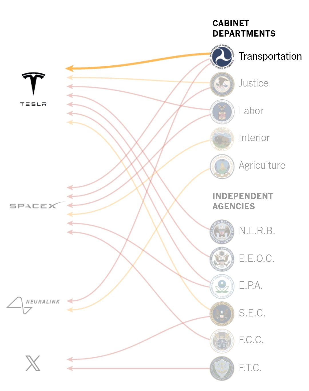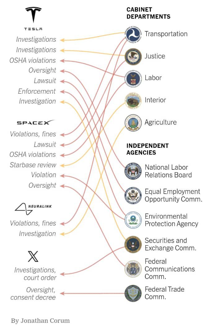 Through a review of court filings, regulatory dockets and government contracting data, The New York Times has compiled an accounting of Elon Musk’s multipronged business arrangements with the federal government, as well as the violations, fines, consent decrees and other inquiries federal agencies have ordered against his companies. Together, they show a deep web of relationships: Instead of entering this new role as a neutral observer, Mr. Musk would be passing judgment on his own customers and regulators.
